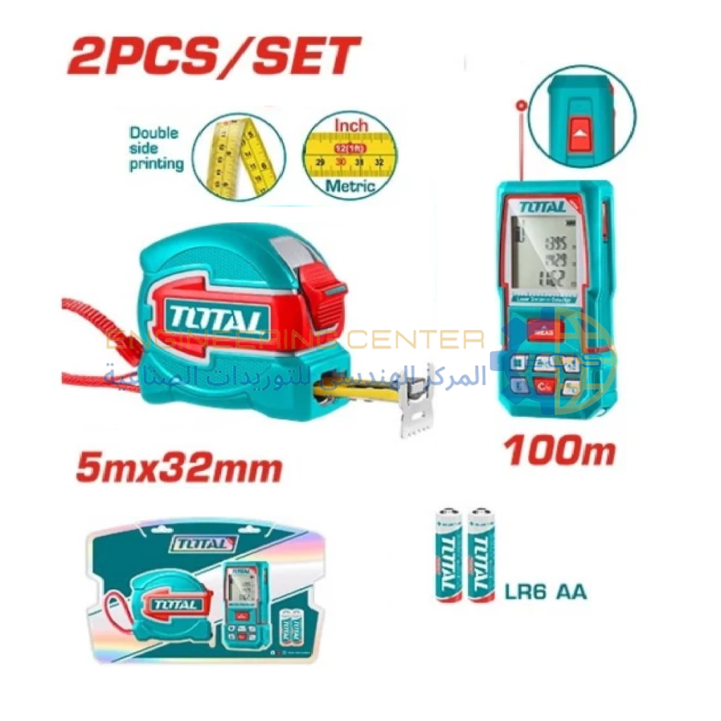 طقم عدة 2 قطعة (متر ليزر 100 متر + شريط قياس 5 متر) توتال