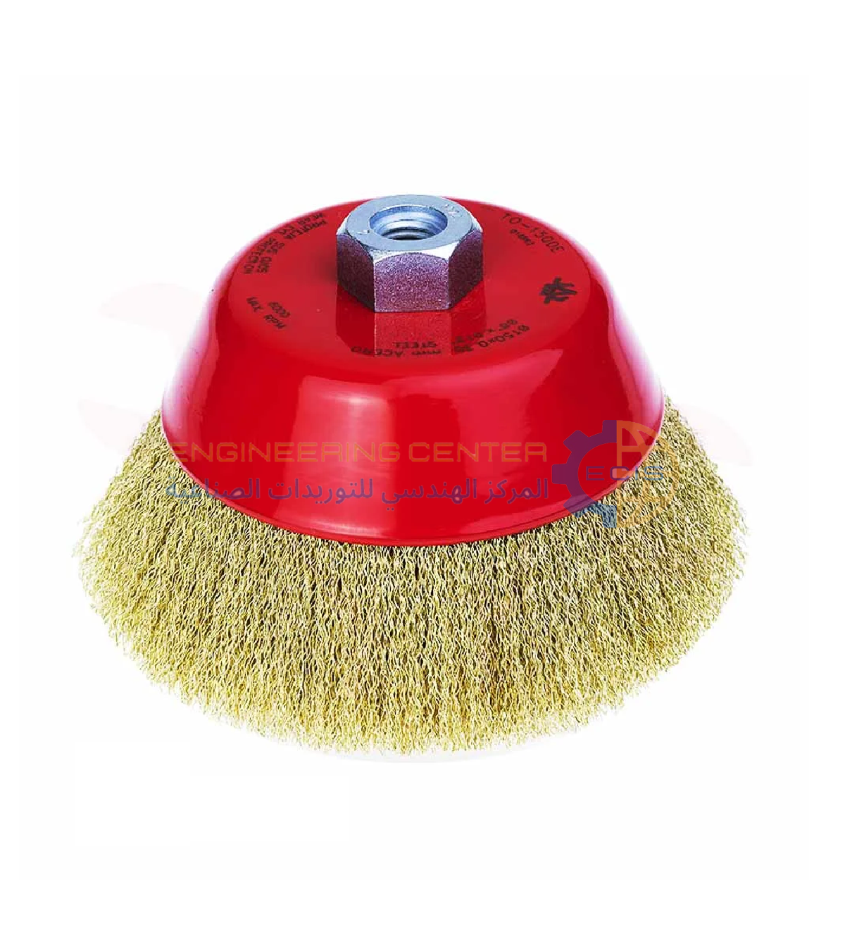 النوع: فرشاة كوبية حرة (Crimped Wire Cup Brush)، مما يعني أن الأسلاك مموجة وغير مجدولة بإحكام، مما يوفر تنظيفًا بكثافة متوسطة وقدرة إزالة جيدة دون أن تكون شديدة العدوانية مثل الفرش المجدولة.