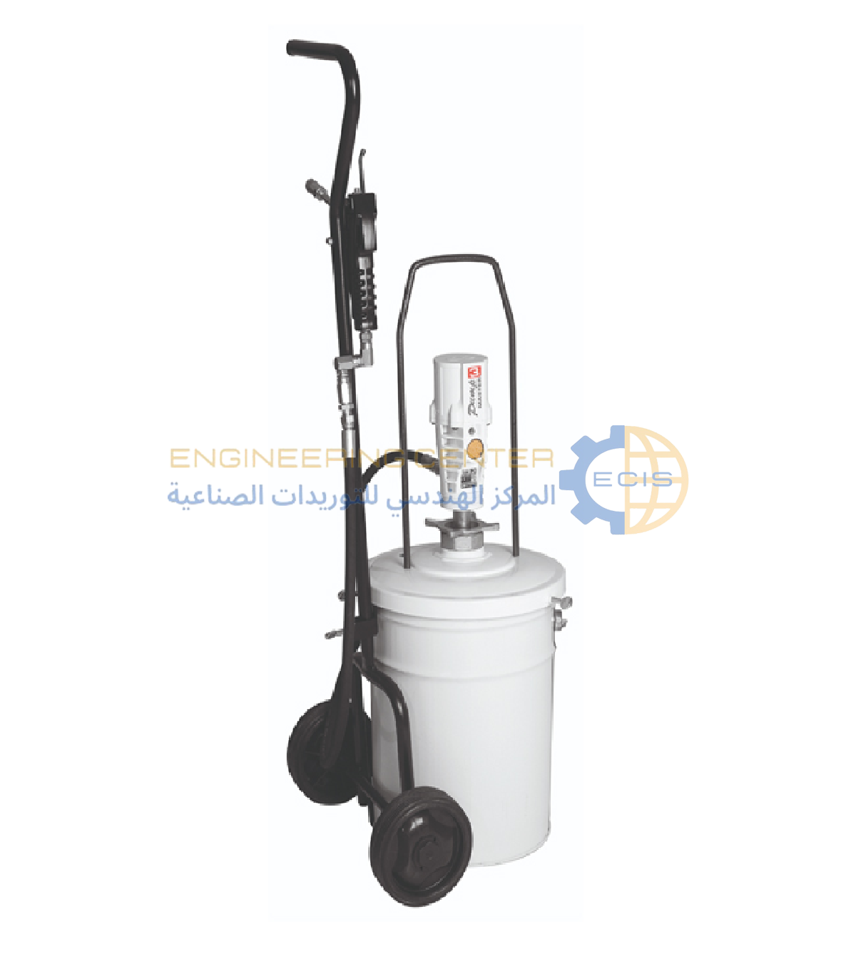 البرميل والعربة: تأتي الطلمبة مثبتة على عربة (Trolley) متينة مزودة بعجلتين كبيرتين لتسهيل التنقل داخل الورشة، مع خزان (برميل) يتسع لـ 20 كيلو جرام من الشحم.