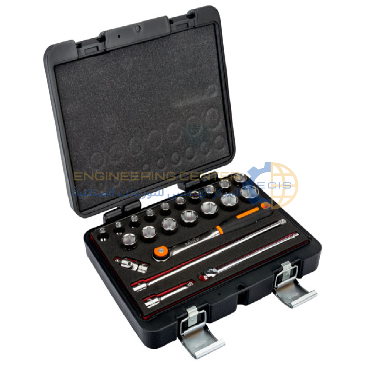 التخزين: يتم تخزين المجموعة بأكملها في علبة بلاستيكية متينة (بولي إيثيلين عالي الكثافة) مقاومة للصدمات والزيوت، مما يضمن تخزينًا آمنًا ومنظمًا للأدوات.