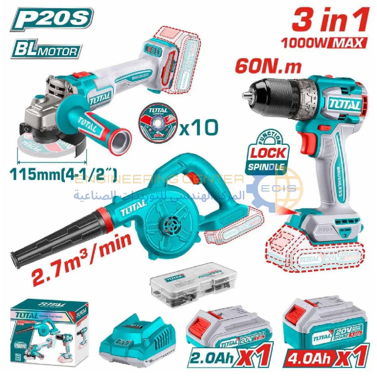 البطاريات: الطقم يأتي مع بطاريتين ليثيوم أيون؛ واحدة بسعة 4.0 أمبير للأعمال الشاقة، والأخرى 2.0 أمبير للأعمال الخفيفة.